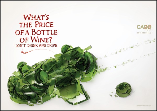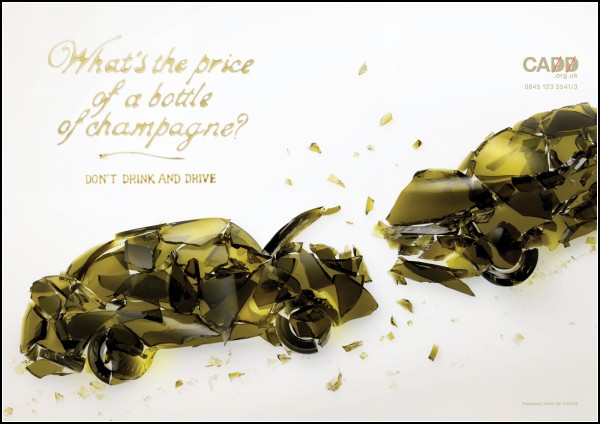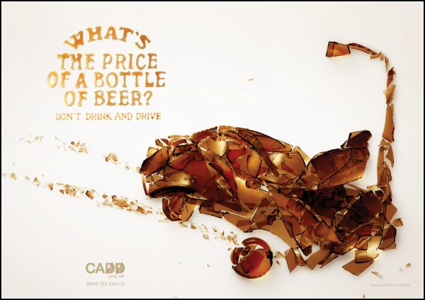 Так, проти пияцтва за кермом Лондонська рекламна компанія JWT London випустила декілька оригінальних і креативних принтів. В такий спосіб вона підтримує акцію проти пияцтва і хоче привернути до цієї проблеми увагу громадськості. Основним матеріалом для виготовлення ілюстрацій є бите скло. Ось подивіться що з цього вийшло.