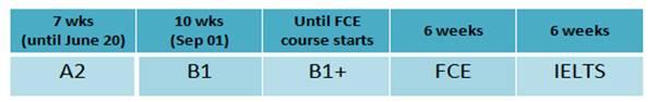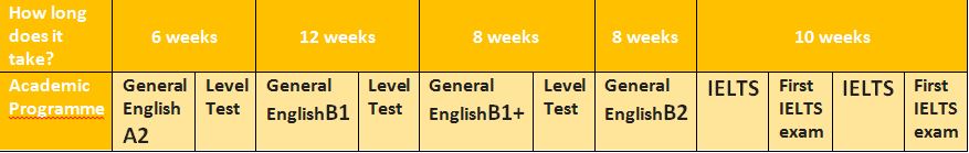 It is also important to know why you are studying English. Do you need to enter a UK university? This usually requires an IELTS score of 5.5 for a pre-sessional course or 6.5 for graduate level programmes. If you take a placement test and your level is mid-level A2, we would recommend the following plan for you if you needed an IELTS score of 6.5. We would recommend moving to IELTS halfway through the B2 level as this would be the optimum General English level to benefit most from the IELTS course.