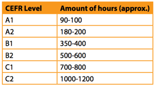 The first thing you need is to understand your level – internationally these are based on the Common European Framework (CEFR) levels – A1 to C2. Once you understand your different levels for your different skills (students very often have stronger reading than speaking, for example) you can have a realistic timeline for your academic plan. An average student at our school takes 10.3 weeks to progress to the next level, but this depends on hours studied per week. It also depends on the level, as the higher the level, the longer it takes. This is demonstrated in the table below.